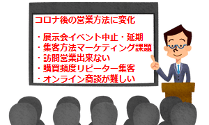 コロナ後の営業方法は非対面営業が主流となりオンライン商談ツールを利用することが増えた。リアル展示会イベントでリードを集め見込み客へ営業する従来のスタイルがコロナ感染対策で訪問出来ない営業環境にマーケティング担当者も集客方法が難しくなった営業マンはオンライン商談が難しいという課題やメリットデメリットについて